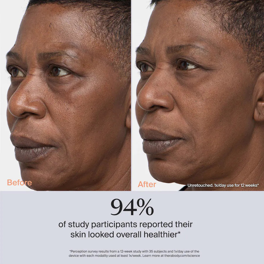 *Results from a 12-week clinical study with 35 subjects and 1x/day use of the device with each modality used at least 1x/week [using expert clinical grading, perception surveys and image analyses]. Learn more at therabody.com/science